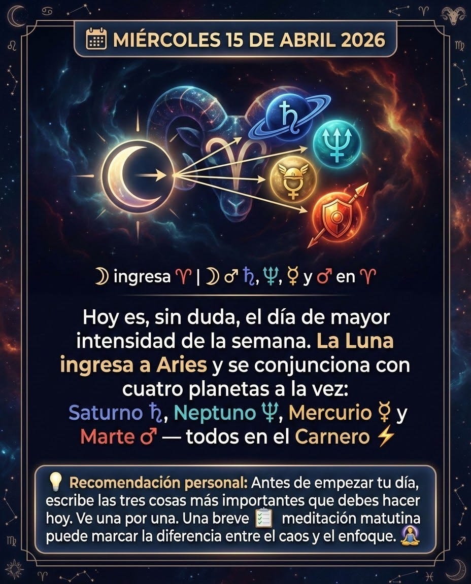 Hoy es, sin duda, el día de mayor intensidad de la semana. La Luna ingresa a Aries y se conjunciona con cuatro planetas a la vez: Saturno ♄, Neptuno ♆, Mercurio ☿ y Marte ♂ — todos en el Carnero ⚡. Disciplina, espiritualidad, comunicación y acción concentradas en un solo punto.