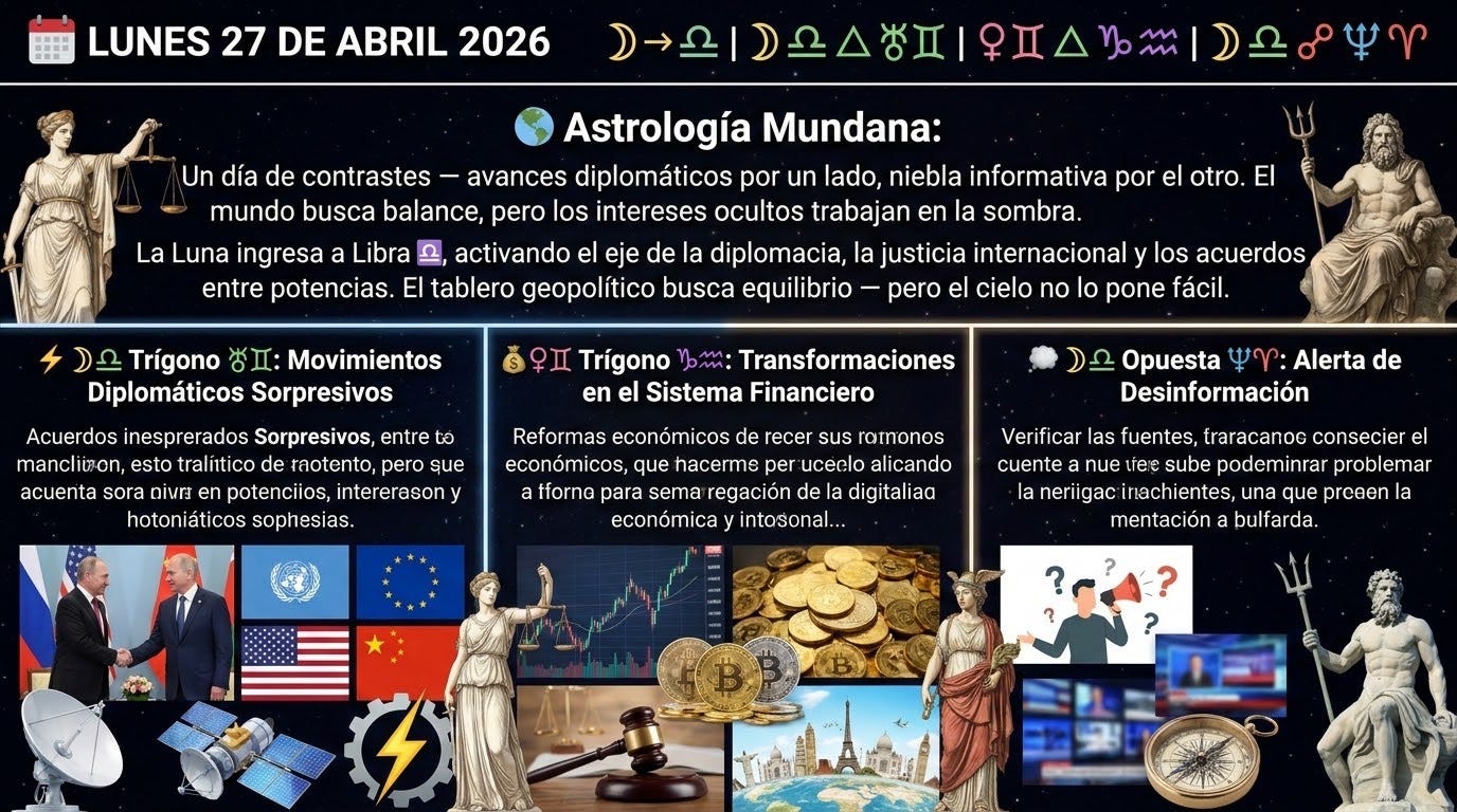 La Luna ingresa a Libra ♎, activando el eje de la diplomacia, la justicia internacional y los acuerdos entre potencias. El tablero geopolítico busca equilibrio — pero el cielo no lo pone fácil.