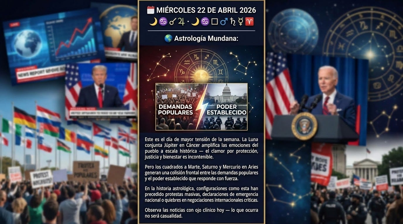 Cáncer Conjunta ♃ Júpiter · Cuadrado a ♂ Marte, ♄ Saturno y ☿ Mercurio en ♈ Aries Este es el día de mayor tensión de la semana. La Luna conjunta Júpiter en Cáncer amplifica las emociones del pueblo a escala histórica — el clamor por protección, justicia y bienestar es incontenible. Pero los cuadrados a Marte, Saturno y Mercurio en Aries generan una colisión frontal entre las demandas populares y el poder establecido que responde con fuerza. En la historia astrológica, configuraciones como esta han precedido protestas masivas, declaraciones de emergencia nacional o quiebres en negociaciones internacionales críticas. Observa las noticias con ojo clínico hoy — lo que ocurra no será casualidad.
