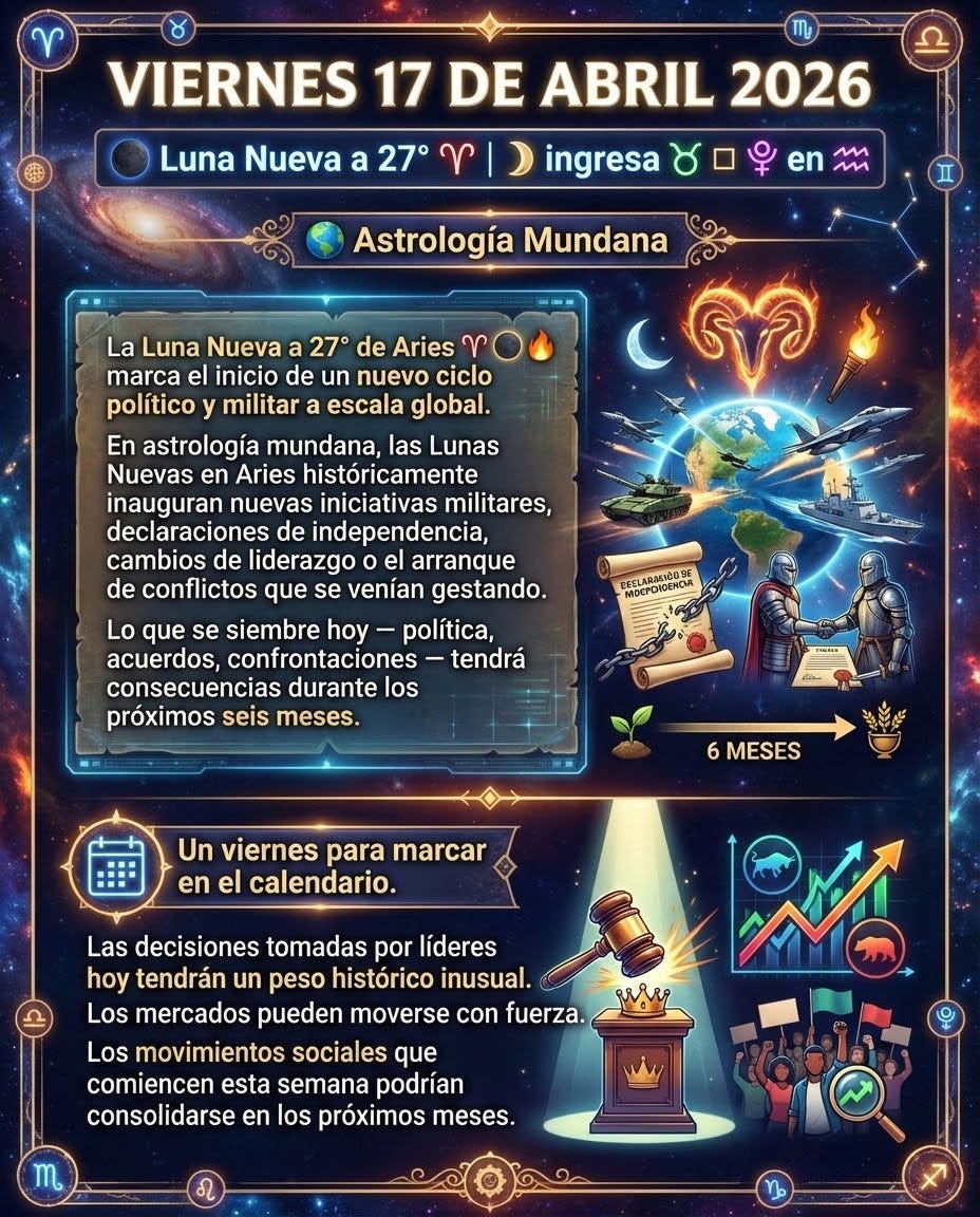 đLa Luna Nueva a 27° de Aries âđđĽ marca el inicio de un nuevo ciclo polĂtico y militar a escala global. En astrologĂa mundana, las Lunas Nuevas en Aries histĂłricamente inauguran nuevas iniciativas militares, declaraciones de independencia, cambios de liderazgo o el arranque de conflictos que se venĂan gestando. Lo que se siembre hoy â polĂtica, acuerdos, confrontaciones â tendrĂĄ consecuencias durante los prĂłximos seis meses.