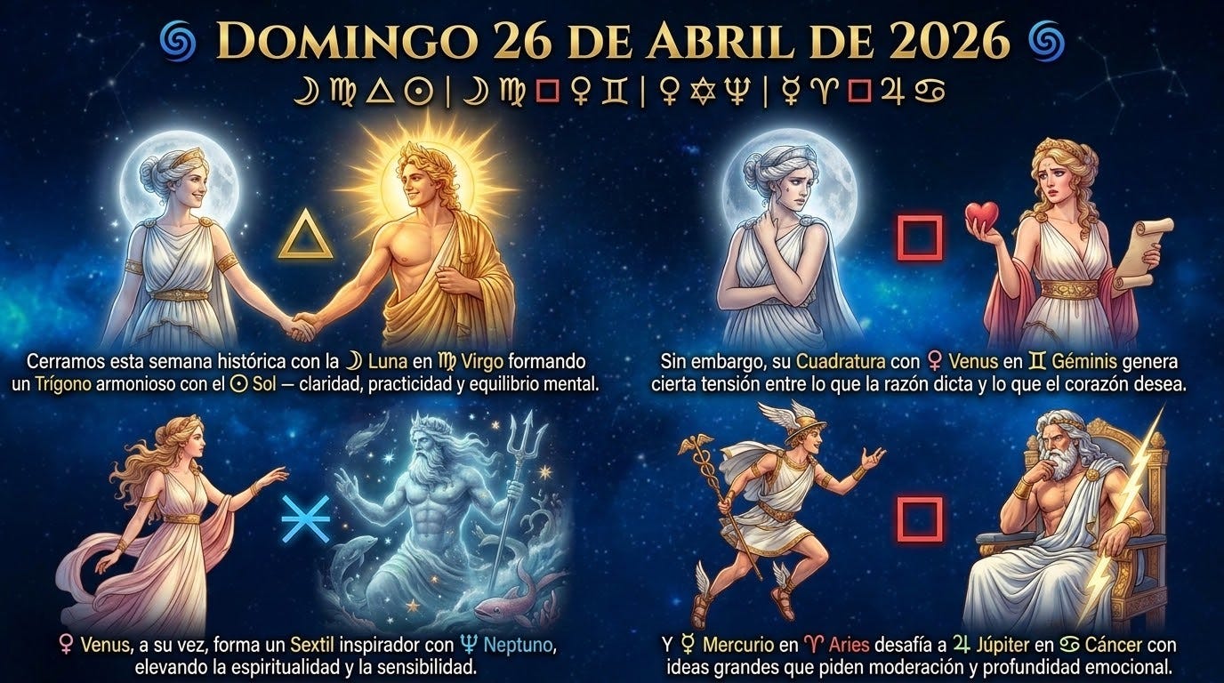 🌿Cerramos esta semana histórica con la 🌙 Luna en ♍ Virgo formando un Trígono armonioso con el ☉ Sol — claridad, practicidad y equilibrio mental. Sin embargo, su Cuadratura con ♀ Venus en ♊ Géminis genera cierta tensión entre lo que la razón dicta y lo que el corazón desea. ♀ Venus, a su vez, forma un Sextil inspirador con ♆ Neptuno, elevando la espiritualidad y la sensibilidad. Y ☿ Mercurio en ♈ Aries desafía a ♃ Júpiter en ♋ Cáncer con ideas grandes que piden moderación y profundidad emocional.