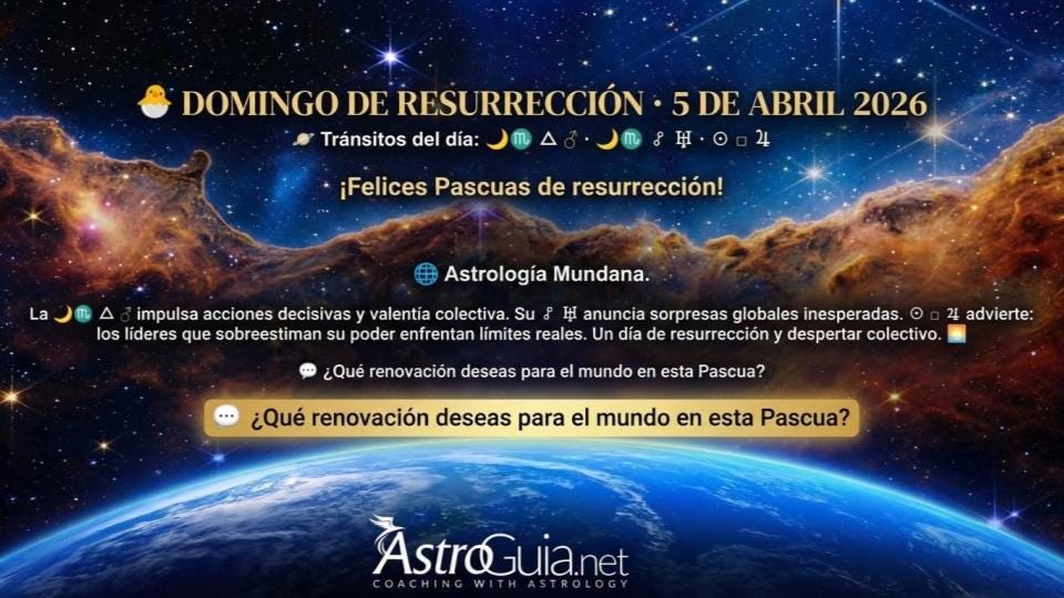 Astro-Amigos 🐣, ¡Felices Pascuas de resurrección! La 🌙♏ △ ♂ impulsa acciones decisivas y valentía colectiva. Su ☍ ♅ anuncia sorpresas globales inesperadas. ☉ □ ♃ advierte: los líderes que sobreestiman su poder enfrentan límites reales. Un día de resurrección y despertar colectivo. 🌅