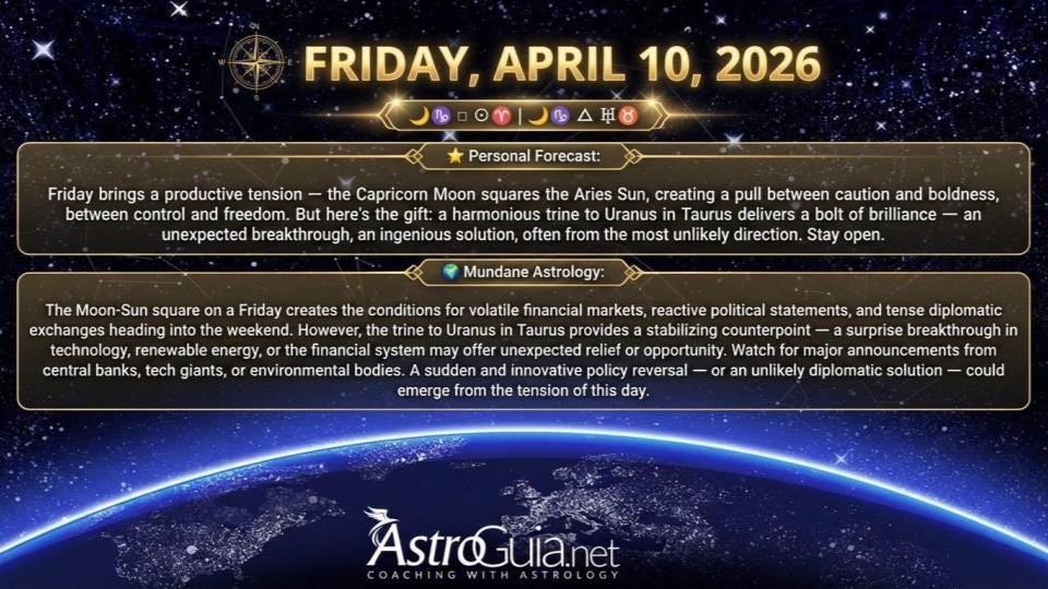 Hey, Astro-Friends! ⚡ Friday brings a productive tension — the Capricorn Moon squares the Aries Sun, creating a pull between caution and boldness, between control and freedom. But here’s the gift: a harmonious trine to Uranus in Taurus delivers a bolt of brilliance — an unexpected breakthrough, an ingenious solution, often from the most unlikely direction. Stay open.