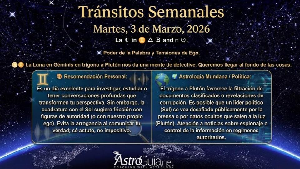 ¡Feliz inicio de semana, comunidad! 🌑♍🌊 Hoy la Luna entra en Virgo, invitándonos a poner orden, pero cuidado: hace un aspecto incómodo (quincuncio) a Neptuno, Saturno y Plutón. Además, Marte ingresa en Piscis. ¿Qué significa esto? Nuestra energía de acción se vuelve más espiritual, pero también un poco dispersa. ✅ Recomendación: Es un día para actuar …