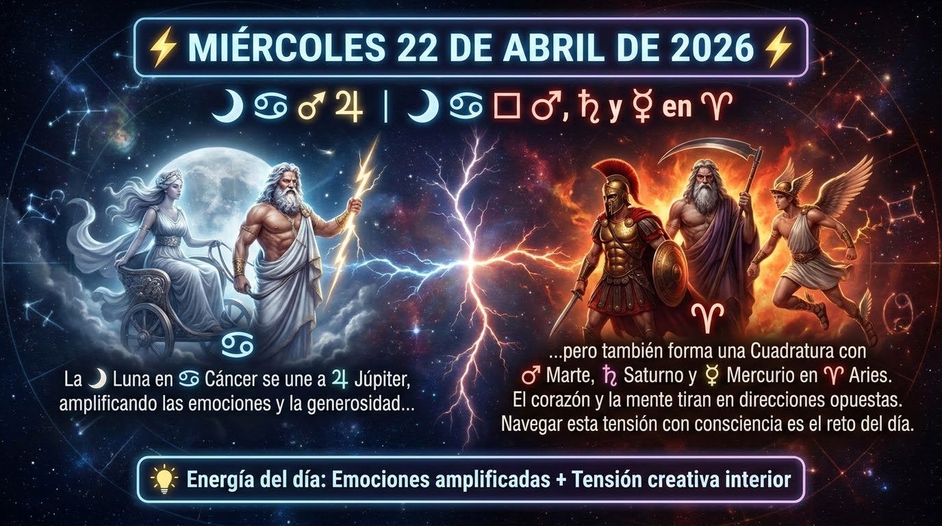 La 🌙 Luna en ♋ Cáncer se une a ♃ Júpiter, amplificando las emociones y la generosidad... pero también forma una Cuadratura con ♂ Marte, ♄ Saturno y ☿ Mercurio en ♈ Aries. El corazón y la mente tiran en direcciones opuestas. Navegar esta tensión con consciencia es el reto del día.