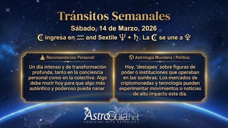 ¡El sábado más poderoso de la semana! La Luna abandona el pragmatismo de Capricornio y entra al visionario Acuario, activando de inmediato una triada de aspectos excepcionales: Sextil a Neptuno y a Saturno en Aries — inspiración elevada con estructura real — y la pieza más profunda del ciclo: una Conjunción con Plutón en Acuario. Algo está listo para transformarse hoy, y el cielo no solo lo permite — lo exige con claridad.