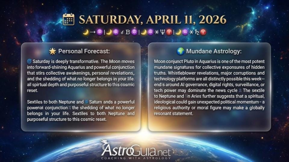 Hey, Astro-Friends! 🌀 Saturday is deeply transformative. The Moon moves into forward-thinking Aquarius and immediately meets Pluto — a powerful conjunction that stirs collective awakenings, personal revelations, and the shedding of what no longer belongs in your life. Sextiles to both Neptune and Saturn in Aries add spiritual depth and purposeful structure to this cosmic reset.