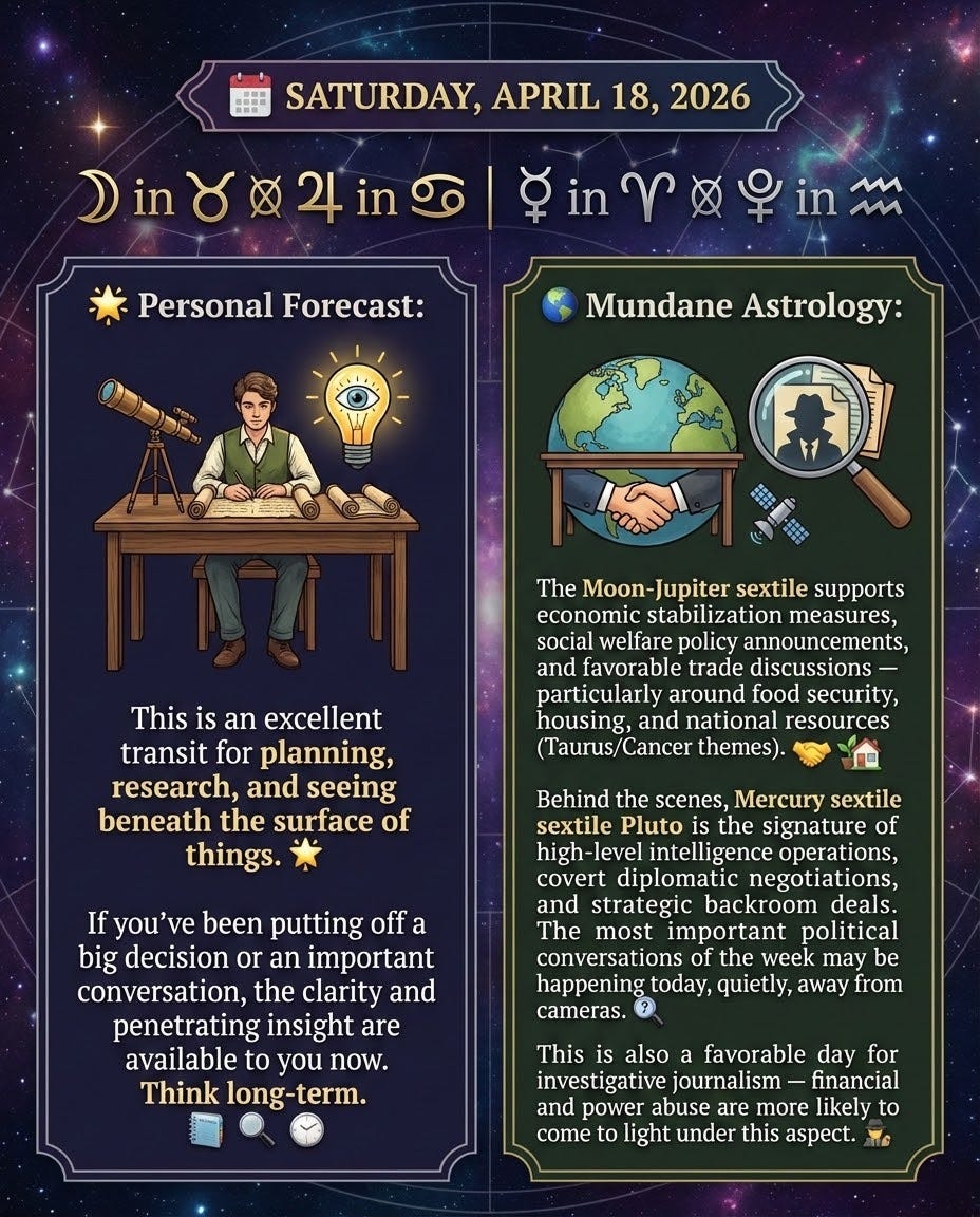 The Moon-Jupiter sextile supports economic stabilization measures, social welfare policy announcements, and favorable trade discussions — particularly around food security, housing, and national resources (Taurus/Cancer themes). Behind the scenes, Mercury sextile Pluto is the signature of high-level intelligence operations, covert diplomatic negotiations, and strategic backroom deals. The most important political conversations of the week may be happening today, quietly, away from cameras. This is also a favorable day for investigative journalism — financial corruption and power abuse are more likely to come to light under this aspect. 🕵️♂️