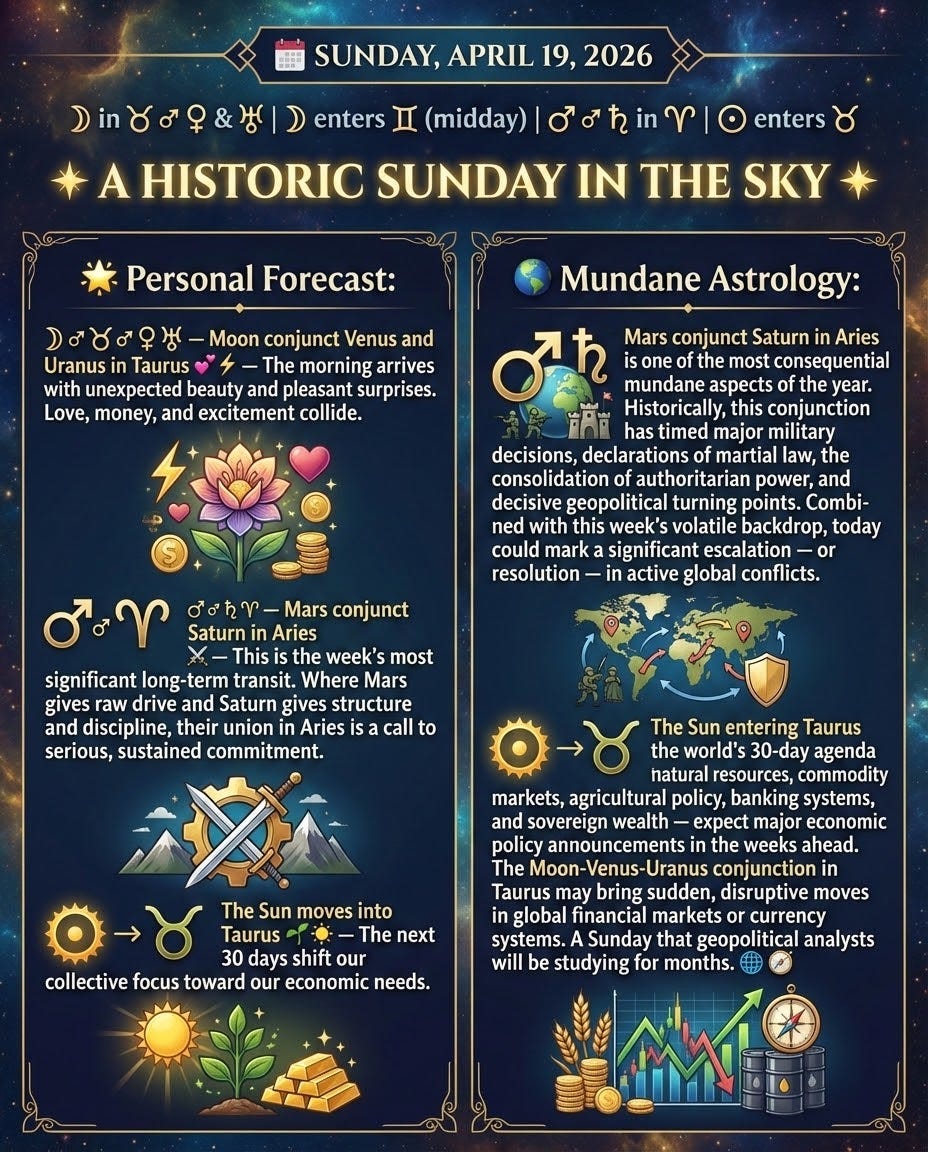 Mars conjunct Saturn in Aries is one of the most consequential mundane aspects of the year. Historically, this conjunction has timed major military decisions, declarations of martial law, the consolidation of authoritarian power, and decisive geopolitical turning points. Combined with this week’s volatile backdrop, today could mark a significant escalation — or resolution — in active global conflicts. The Sun entering Taurus shifts the world’s 30-day agenda toward natural resources, commodity markets, agricultural policy, banking systems, and sovereign wealth — expect major economic policy announcements in the weeks ahead. The Moon-Venus-Uranus conjunction in Taurus may bring sudden, disruptive moves in global financial markets or currency systems. A Sunday that geopolitical analysts will be studying for months. 🌐🧭