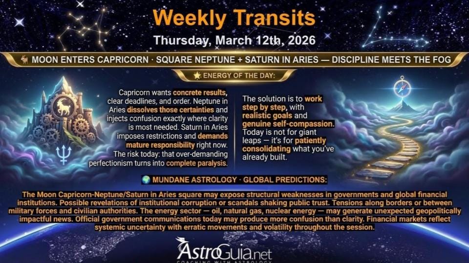 The Moon leaves fiery Sagittarius and lands on the solid ground of Capricorn. But today the path is far from clear: the Moon forms Squares to both Neptune and Saturn, both in Aries — creating a friction between what you want to build, the clarity you don’t yet have, and the limits the universe is firmly placing before you. The energy asks for work — but…