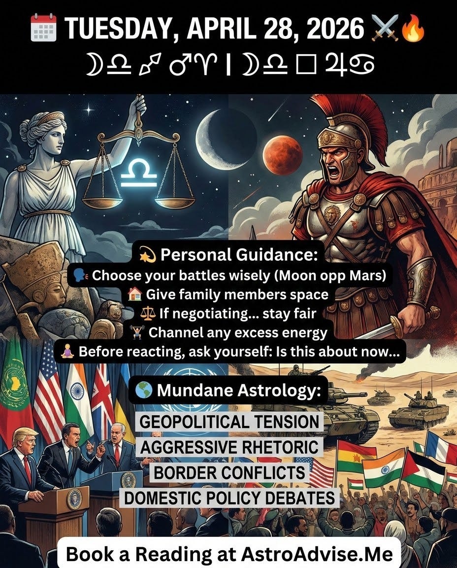 Tuesday carries a strong charge of tension and action. The Libra Moon is being pulled in two directions — and you may feel that push-pull between what you want and what others expect from you. This is a day that demands emotional intelligence over impulsive reaction.