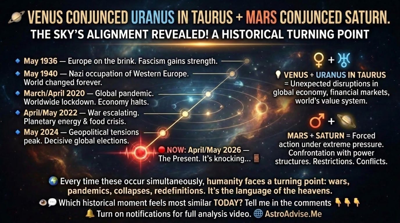 I just recorded a video in English for another channel, explaining the transits for next month—May 2026—and the question came up about when in the past we had the combination of: 🪐 VENUS CONJUNCTION URANUS IN TAURUS + MARS CONJUNCTION SATURN! And the answer seemed so revealing that I had to share it here with you immediately!