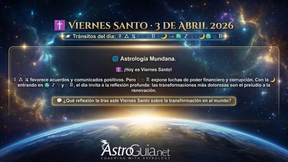 Astro-Amigos ✝️, ¡Feliz Viernes Santo! ☿ △ ♃ favorece acuerdos y comunicados positivos. Pero ♀ □ ♇ expone luchas de poder financiero y corrupción. Con la 🌙 entrando en ♏ ☍ ♀ y □ ♇, el día invita a la reflexión profunda: las transformaciones más dolorosas son el preludio a la renovación.