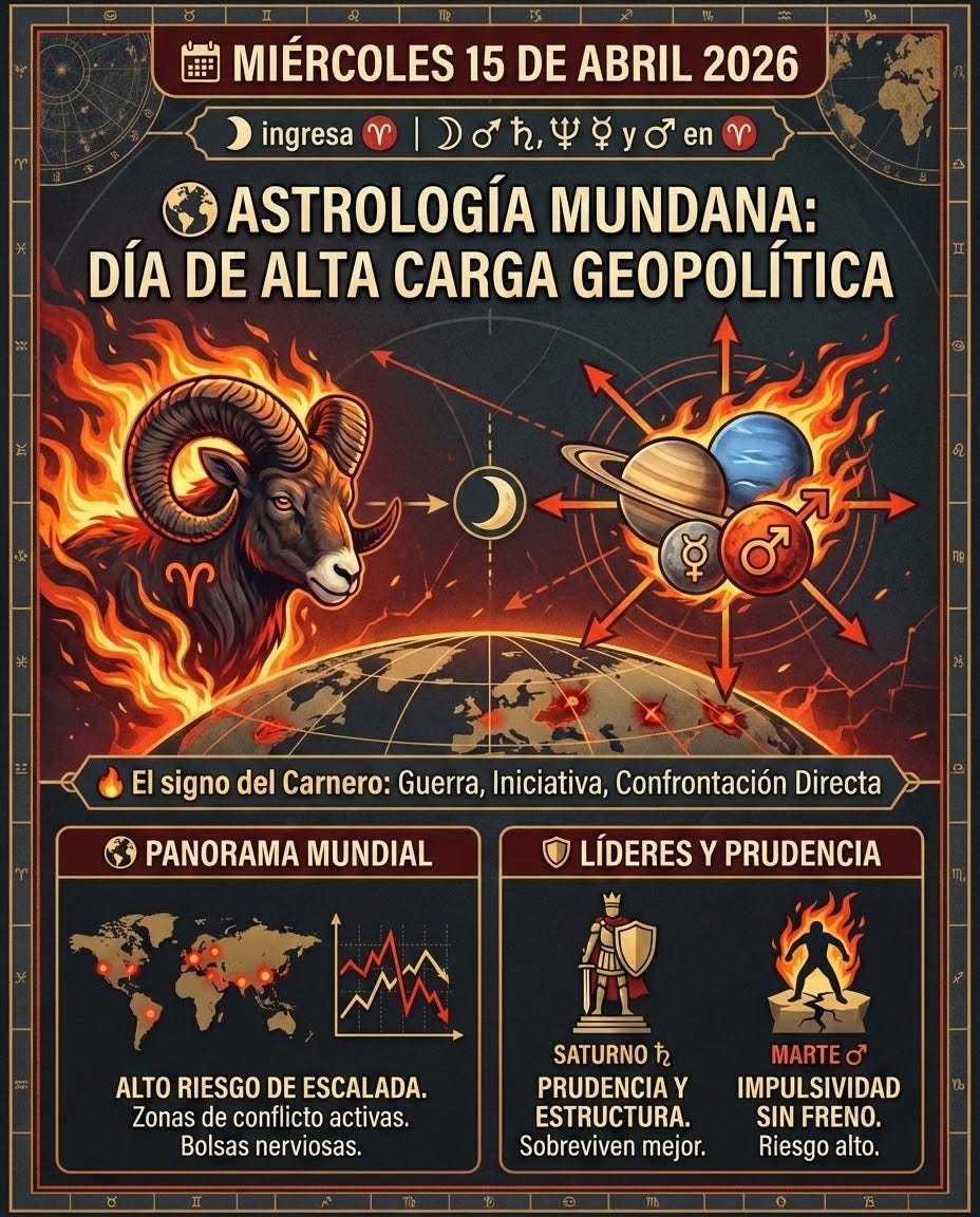 A quadruple conjunction in Aries is a rare and serious mundane signature. Historically, this planetary pattern correlates with significant military mobilizations, emergency governmental measures, institutional power struggles, and large-scale public unrest. The combination of Mars (armed force), Saturn (institutional authority), Neptune (deception and hidden agendas), and Mercury (communications) in the sign of war suggests critical geopolitical decisions being made at speed, without full public transparency. Governments under pressure may announce emergency legislation or security crackdowns. Financial markets are likely jittery. Stay informed — but verify everything before reacting.