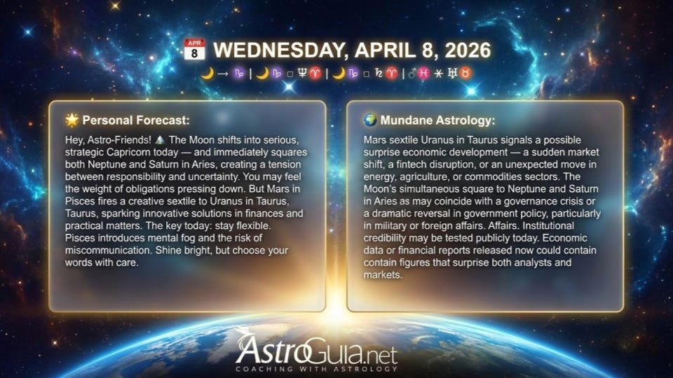 Hey, Astro-Friends! 🏔️ The Moon shifts into serious, strategic Capricorn today — and immediately squares both Neptune and Saturn in Aries, creating a tension between responsibility and uncertainty. You may feel the weight of obligations pressing down. But Mars in Pisces fires a creative sextile to Uranus in Taurus, sparking innovative solutions in finances and practical matters. The key today: stay flexible.